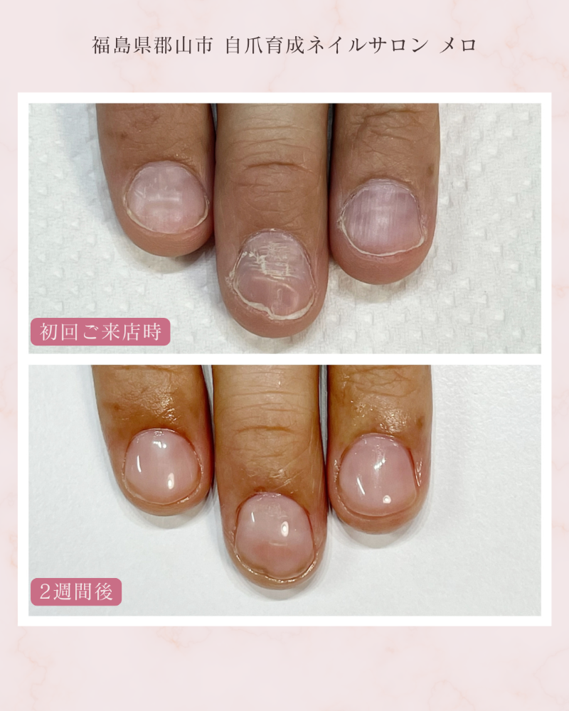 本日は自爪育成モニター様がご来店下さいましたこちらのモニター様は2回目の施術でした初回ご来店時との比較写真です↓