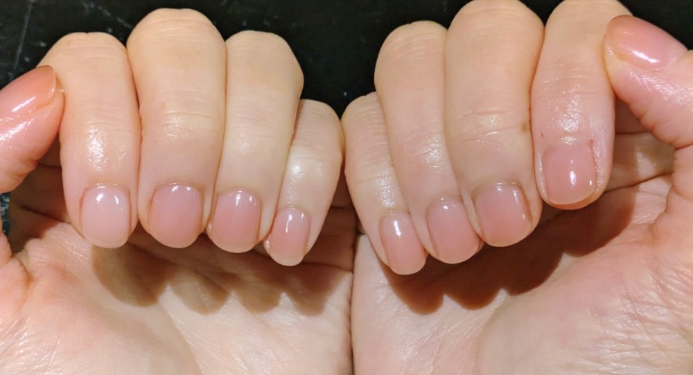 初回の施術後です。自爪が短い上に乾燥で割れやすく、今まではずっと伸ばしてセルフネイルでした。カウンセリングと説明、施術で3時間かかりましたが、とても丁寧に施術していただき、長さは短くても綺麗に見えて嬉しいです。次回を楽しみに、自宅でもオイルケア等を頑張ります!